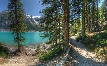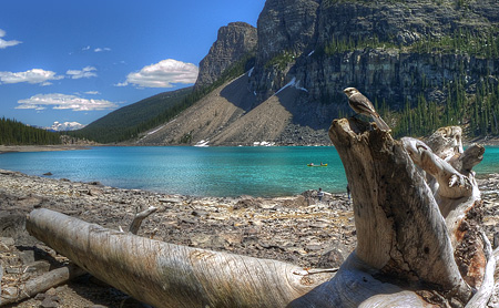 We visited this beautiful little lake in the Canadian Rockies on June 13th. The ice had just gone out and the water level, which recedes over winter, was still low. A late spring had delayed the snowmelt. The Valley of the Ten Peaks is the gleaming backdrop. Elevations of these peaks, which lie along the continental divide, exceed 3,000 meters.
