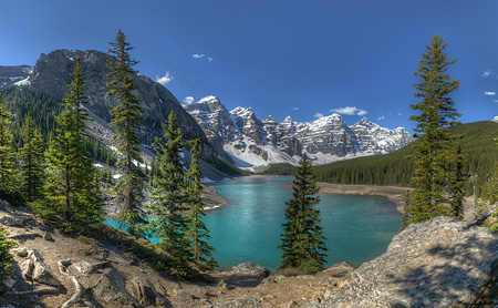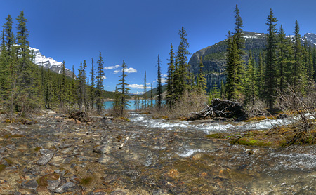 We visited this beautiful little lake in the Canadian Rockies on June 13th. The ice had just gone out and the water level, which recedes over winter, was still low. A late spring had delayed the snowmelt. The Valley of the Ten Peaks is the gleaming backdrop. Elevations of these peaks, which lie along the continental divide, exceed 3,000 meters.